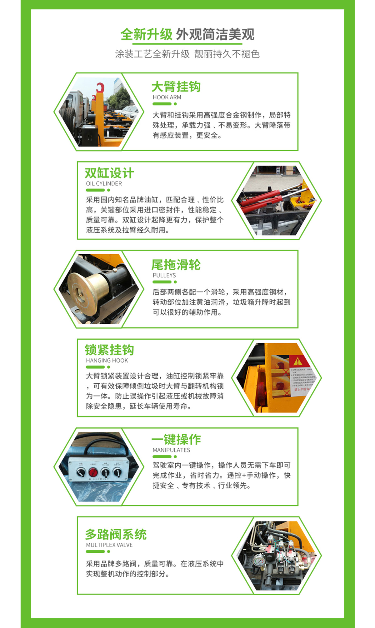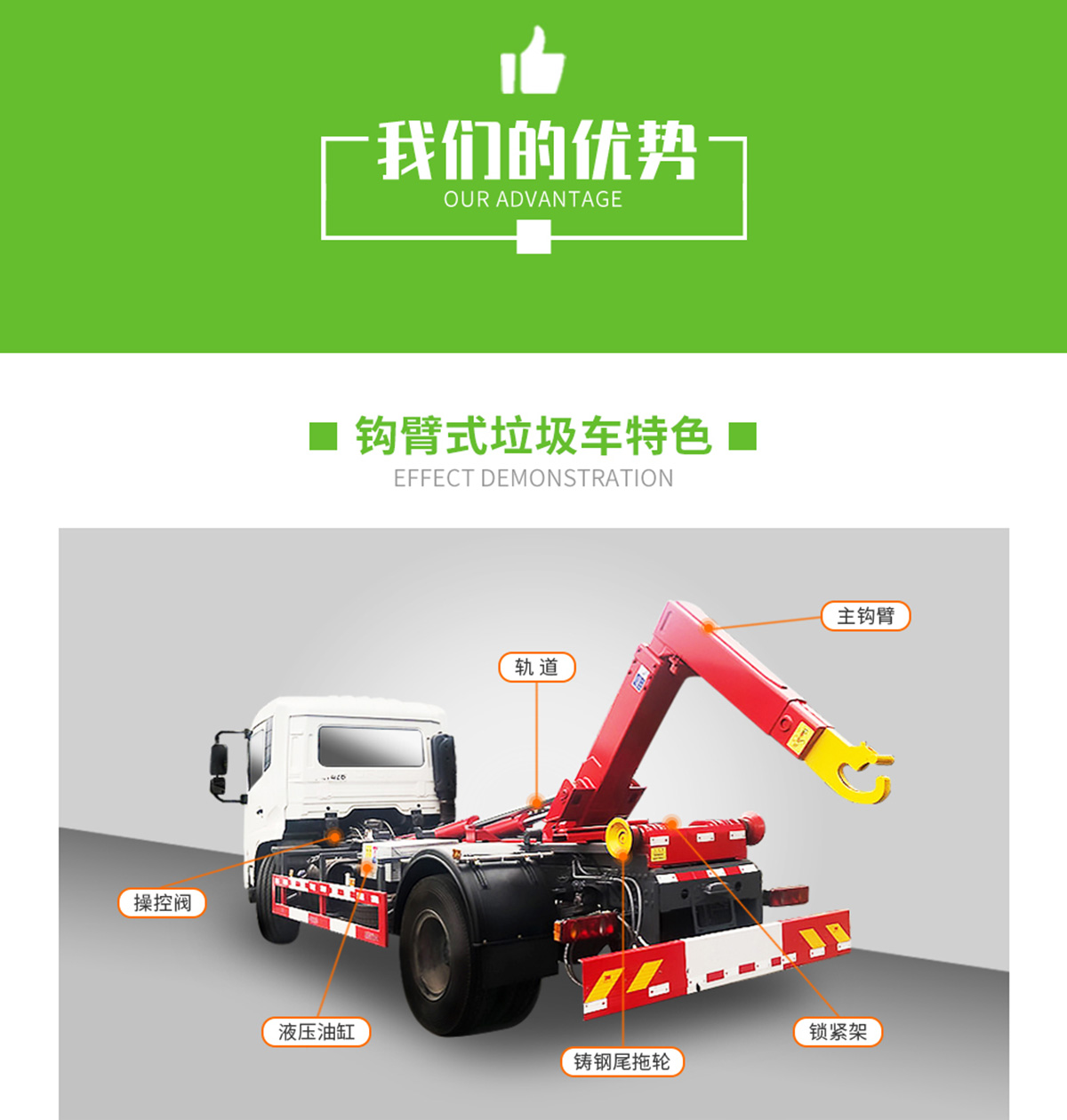 上裝配置:配套12~14方勾臂垃圾箱,主勾臂由高強度板材制作,雙油缸,國產(chǎn)多路閥,液壓油泵,標(biāo)配駕駛室外部操作,可選裝駕駛室室內(nèi)操作,選裝液壓后支腿,防誤操作,帶平衡閥,液壓鎖。